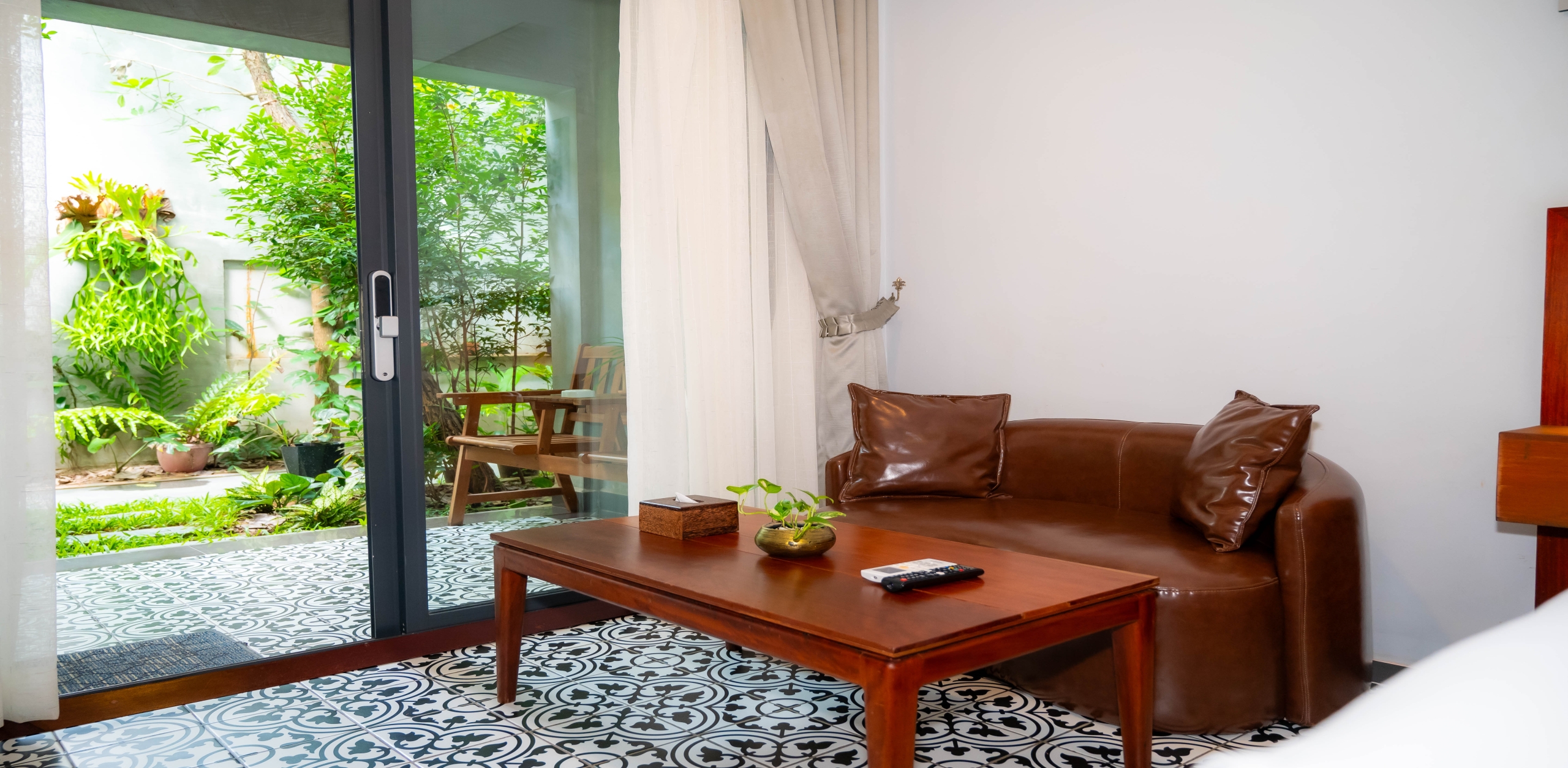 Classic Double Room features a queen bed, polished cement & tiled floors, designed with a private bathroom with a separate shower, equipped with a flat-screen TV, fridge, desk, and sofa with a private terrace perfect for two.